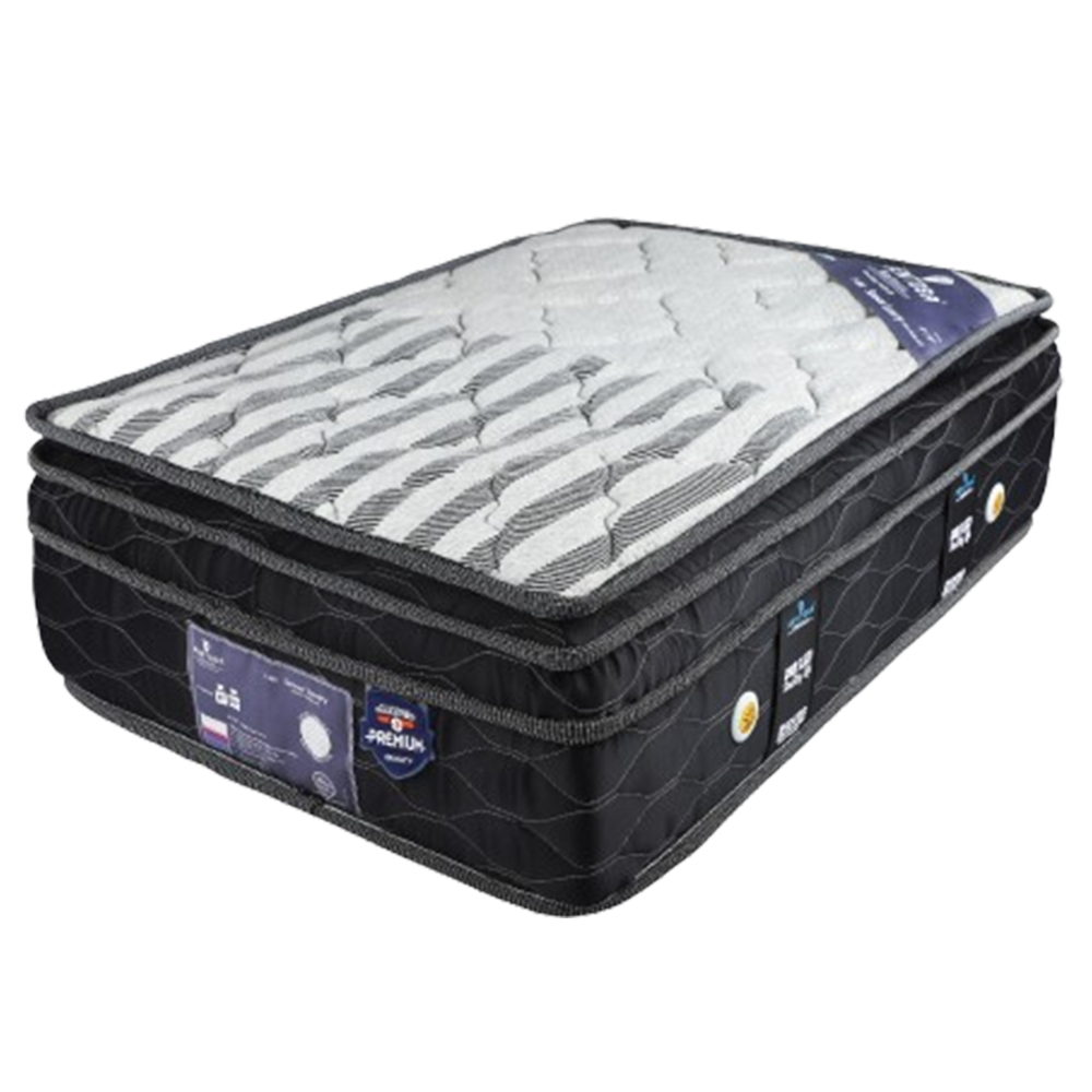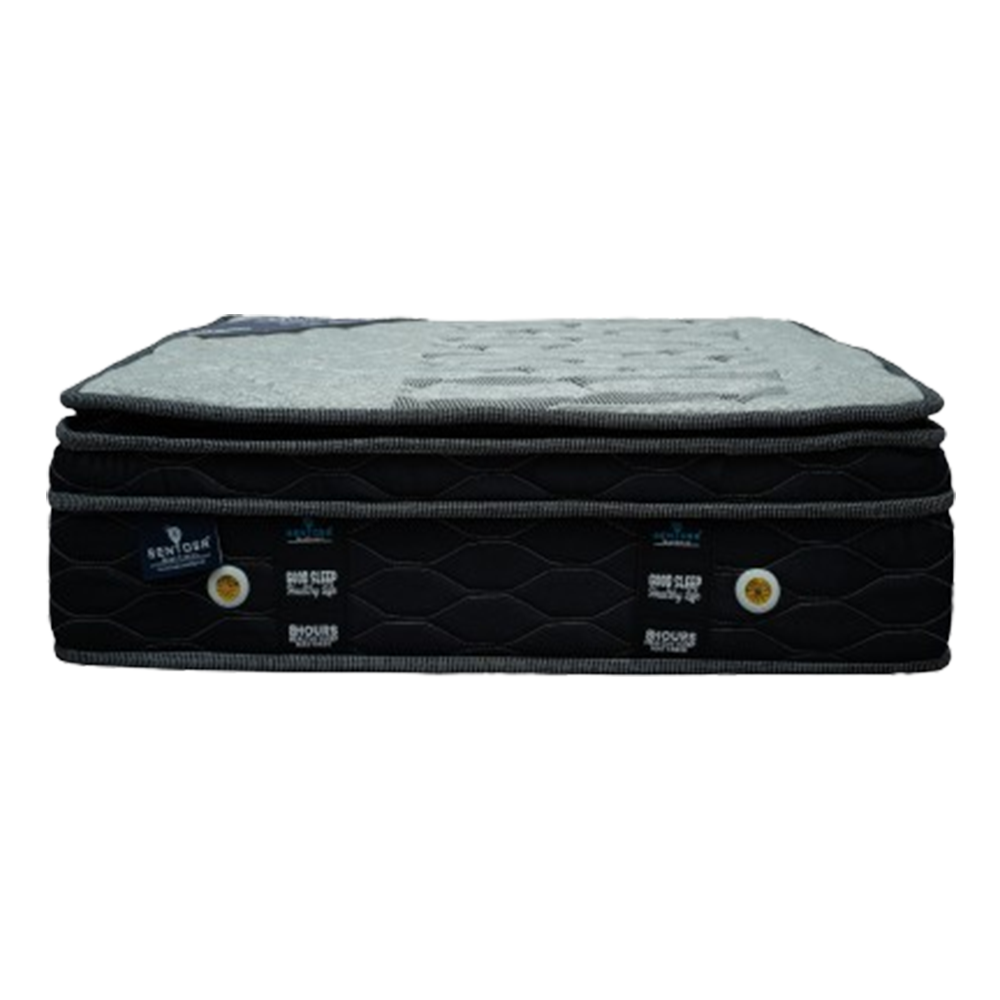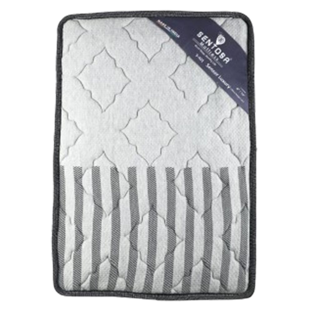 Sensor Luxury offers a superior sleep experience with its advanced multi-layer construction. It features a 21 mm grey-black heavy GSM knitted fabric that ensures a plush, breathable surface. The 1″ micro pocket spring (pillow top) adds responsive support and bounce, complemented by a 1″ layer of high-density (65) memory foam for pressure relief and contouring. A 1″ latex-like foam (50 density) brings durability and added comfort, followed by a 2″ HR premium foam (40 density) for balanced support. Deeper within, a 3″ premium foam (50 density) enhances firmness and stability. The base is finished with a 5 mm quilted anti-skid fabric to ensure the mattress stays firmly in place, delivering uncompromised comfort and restful sleep.